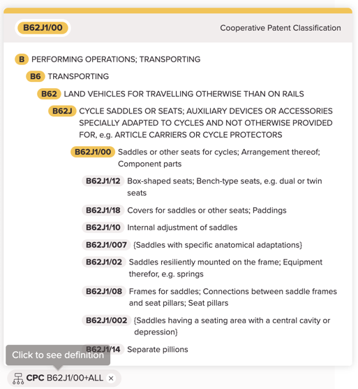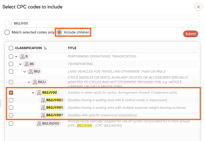 For example, selecting B62J1/00 and choosing Include children will filter results for everything under B62J1 .