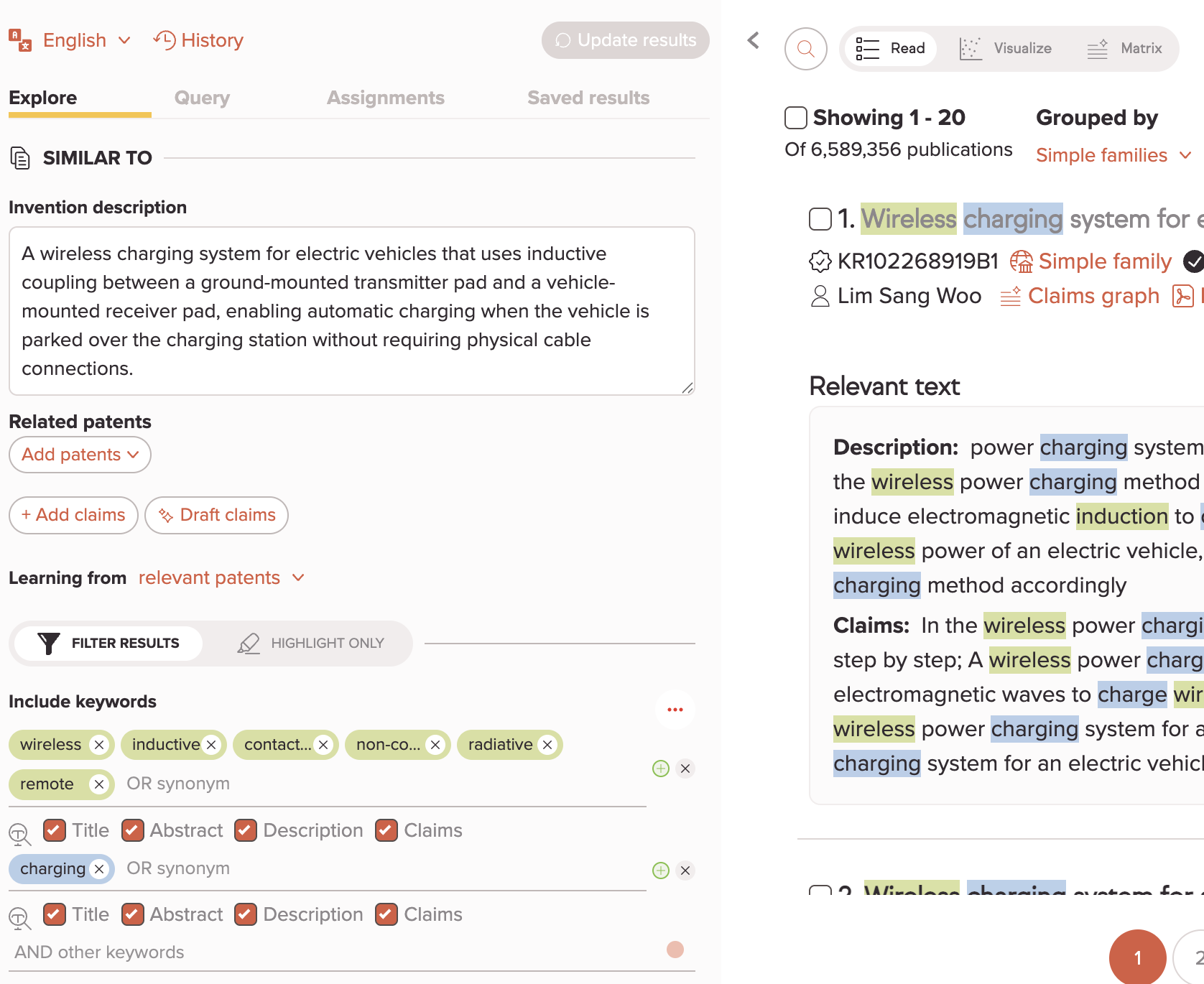 When you're ready to narrow down, switch the keyword from Highlight Only to Filter Results in the keyword panel, then click Update Results. Now only patents containing your keyword will appear.