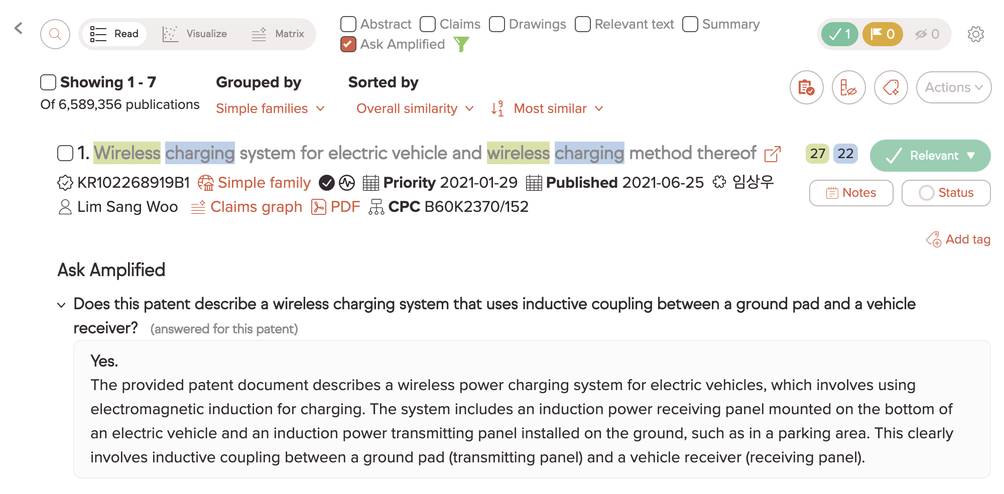 | Find more like what you found | Mark relevant → Update Results | Amplified re-ranks using your selections to surface similar patents |