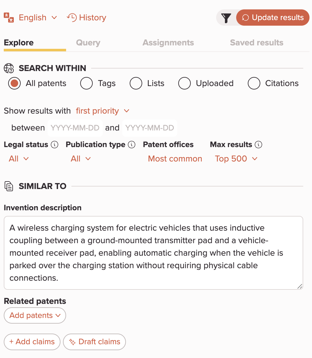 Click Update results. Amplified's AI compares your text against the full text of global patents and ranks results by similarity.