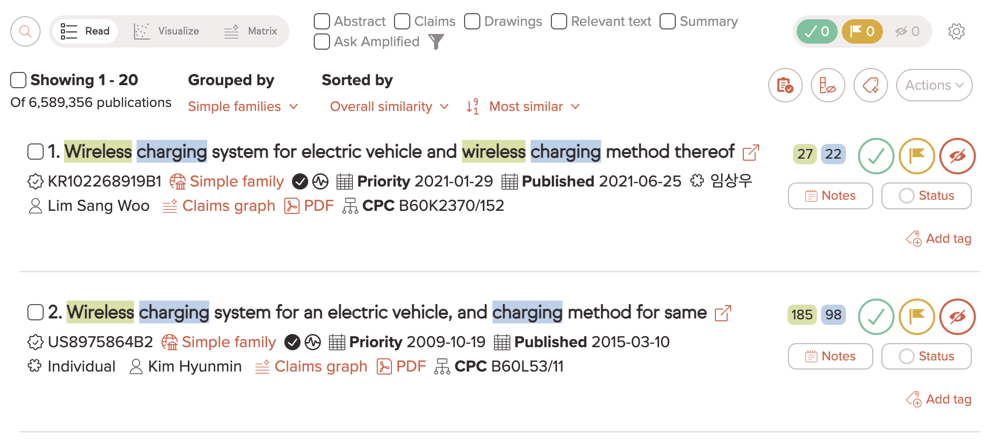 You'll also see the option to Add claims below the main input. If you want to match specifically on claimed features, enter claims text there and then click Update results. Amplified will compare claim language against claim language to re-rank results. Leave it empty for a more general similarity search.